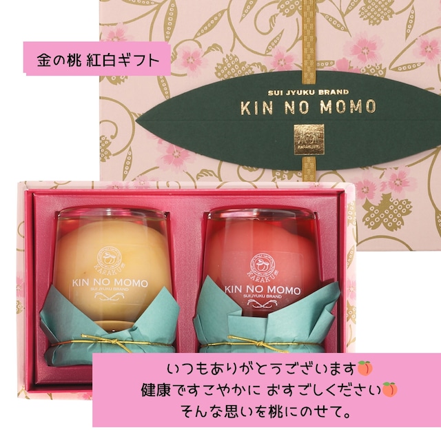 <果樂オンラインショップ限定> 白桃×黄桃の金の桃ギフト どちらもおいしいまるごと桃 ☆少し小ぶりな「おかやまの白桃」を瓶に☆ 今までにない限りなく生に近い状態で1年中おいしく食べていただける桃に仕上げました。 その秘密は自社開発した『水熟製法』 果実の自然の甘さと食感を味わっていただけるように極力甘さを抑え「皮付き」「種あり」のまま「生の風味」で限りなく「生」に近い桃を丸ごと贅沢に詰め込みました。よく熟れてしまっていると皮が破れている場合もありますが、岡山の白桃は皮も薄いので皮ごと食べることもでき、より自然の味わいをお楽しみいただけます。 瓶をひっくり返して桃をイメージ (^ - ^)/ 飾ってもよし!お洒落でかわいらしい見た目です。 ☆おいしい食べ方☆ 桃のように切って食べても、まるごと皮ごと食べてもOK!生の食感を残すため、加熱の時間を最小限に。缶詰やコンポートとはまた違う食感をお楽しみいただけます。 ☆シロップの楽しみ方☆ 桃の香りが高いシロップはいろいろとアレンジが楽しめます。 ホット→お湯割りで桃茶 紅茶にいれてピーチティ アイス→ソーダで桃ソーダ 豆乳・牛乳などミルクで割って ももミルク スパークリングワイン、ハイボールなどお酒との相性も♡ ☆玉手箱のようなピンクの化粧箱入りで、お誕生日などのお祝いごとやお中元・お歳暮など贈り物として喜ばれています。 #誕生日#出産祝#内祝#卒業#就職#入学#ホワイトデー #母の日#敬老の日#クリスマス#お年賀#お歳暮#お中元 ■素材・製造国 自社農園を中心に岡山産の厳選した桃を使用し、手作業で丁寧に瓶詰めしています。 ■原材料名 桃(岡山県産)、グラニュー糖、パラチノース / トレハロース、ビタミンC、酸味料 ■賞味期限 製造より常温で2年です。現在の賞味期限「2026.9.30.」 ※2024年産の黄桃のと2025年産の白桃のセットのため、黄桃に期限をあわせております。 見た目もかわいらしいので、玄関などに飾っておいて(桃には魔除けの言い伝えも!)特別な日に召し上がられるのもおすすめです。 ■商品内容 金の桃 白桃(固形量170g/ 内容総量370g)×1個 金の桃 黄桃(固形量170g/ 内容総量370g)×1個 ■栄養成分表示(100gあたり) エネルギー56kcal, たんぱく質0.3g, 脂質0.05g, 炭水化物14.4g, 食塩相当量0.01g, カリウム83mg ■取り扱い注意事項 開封前は直射日光を避け、常温で保存することをおすすめします。開封後は冷蔵庫で保存し、お早めにお召し上がりください。 ※生の桃をそのまま使用するため、多少の皮の破れがあったり、桃の毛やガクがまざることがありますが品質には問題ございません。 ■発送・注文に関する情報 ご注文は随時受け付けており、通常1〜3営業日以内に発送いたします。配送の際の破損や不具合については、早急に対応いたしますのでご安心ください。 ご質問やご不明な点がございましたら、ショップのお問い合わせページよりお気軽にご連絡ください。皆さまのご利用を心よりお待ちしております。