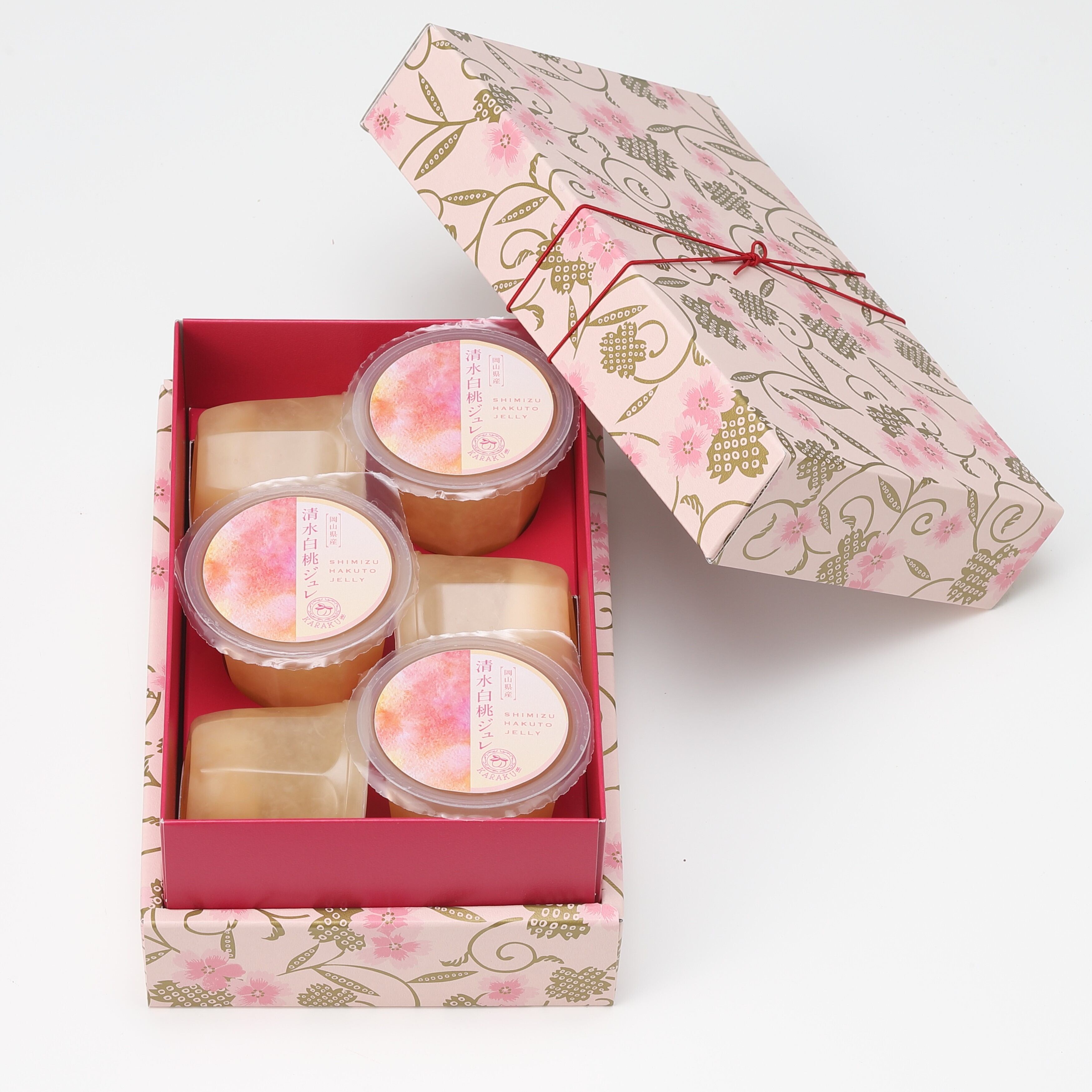 白桃ピューレ(岡山県製造)、砂糖、濃縮もも果汁/ゲル化剤(増粘多糖類)、酸味料、㏗調整剤、酸化防止(V.C)、香料、(一部にもも・ゼラチンを含む)